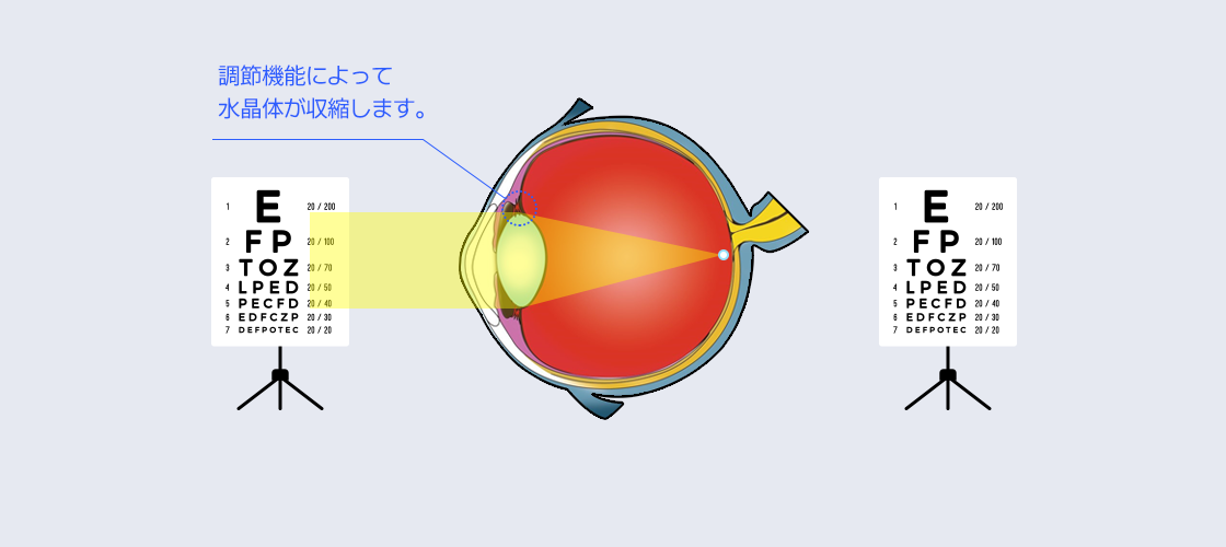 水晶体が収縮・弛緩し、近距離のものがはっきりと見えます。